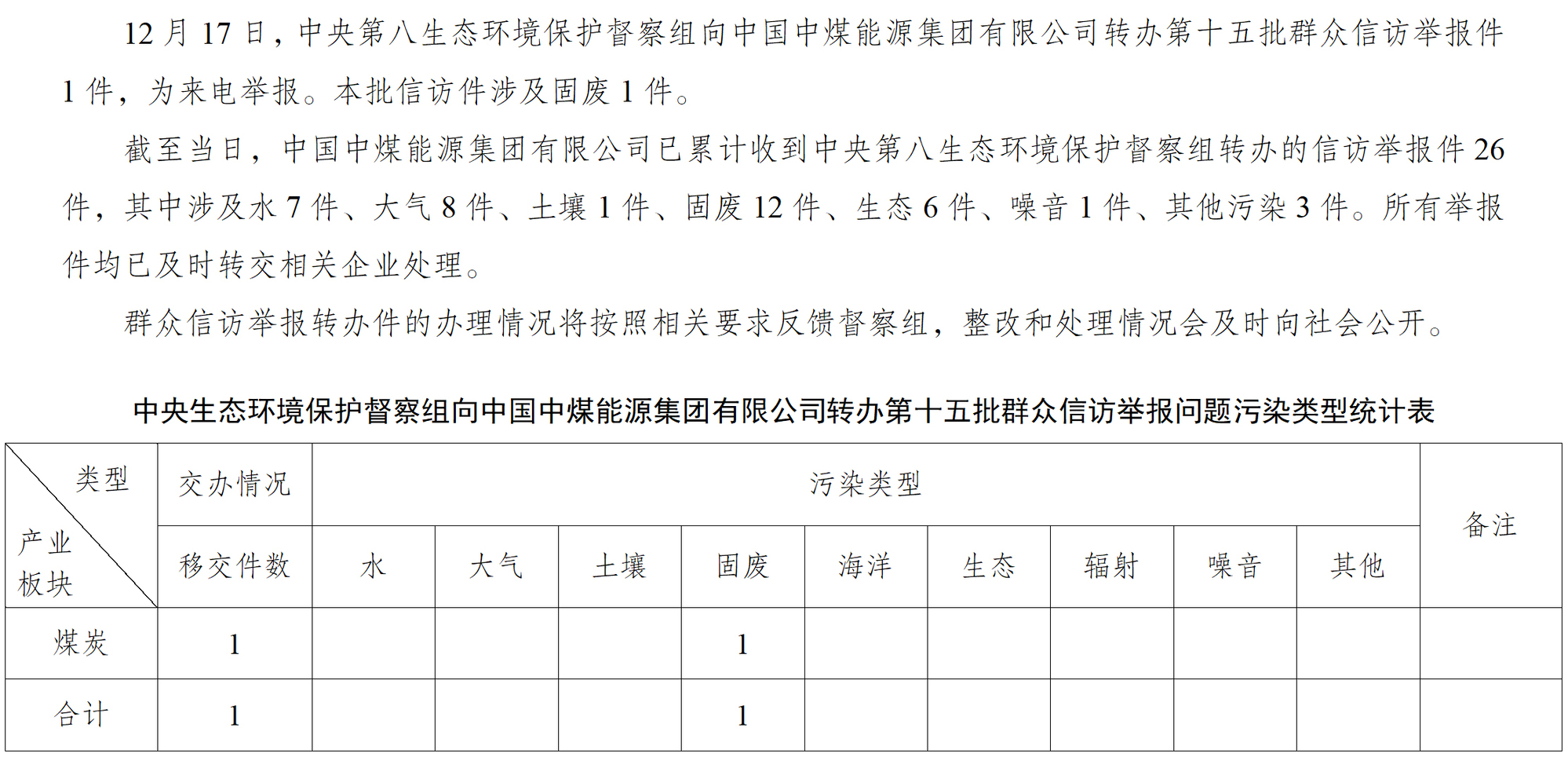 中央第八生態(tài)環(huán)境保護(hù)督察組向中國中煤能源集團(tuán)有限公司轉(zhuǎn)辦第十五批群眾信訪舉報(bào)件